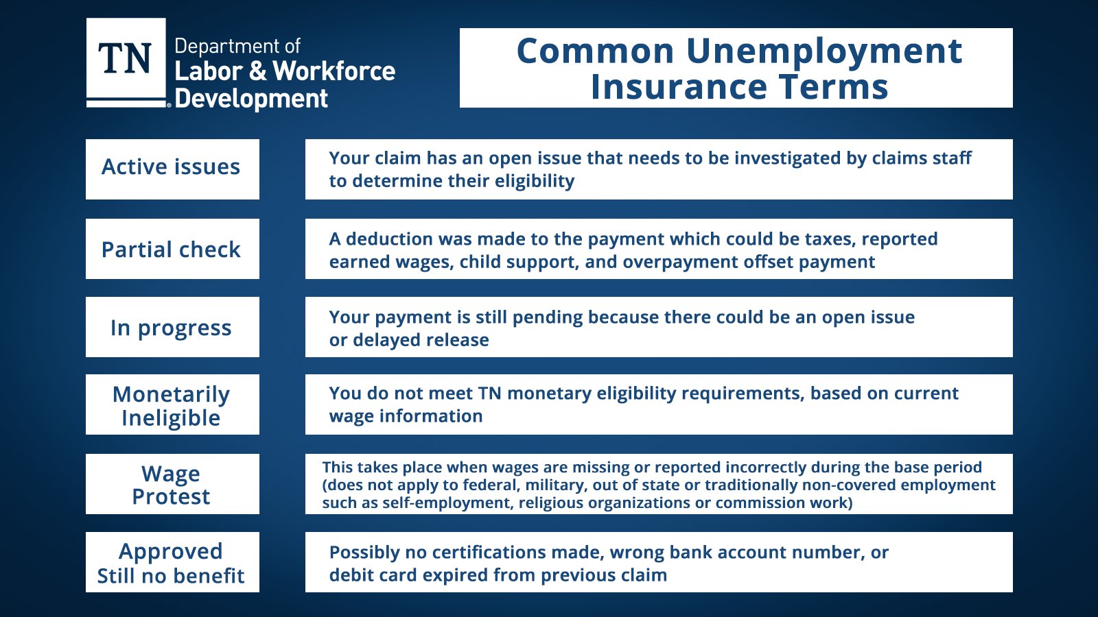 Tennessee Unemployment Phone Numbers. The Tennessee Department of Labor and Workforce Development is the states workplace resource for adult education employment occupational health and safety compensation and. Go to TNgov Before checking your status please allow at least 24 hours from the time you file your claim or submit your weekly certification.